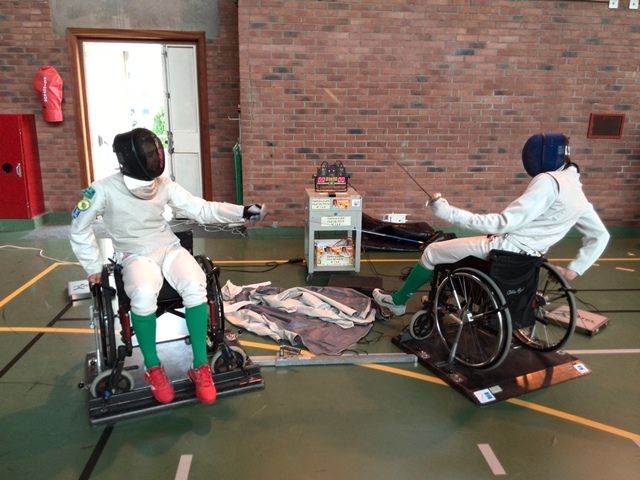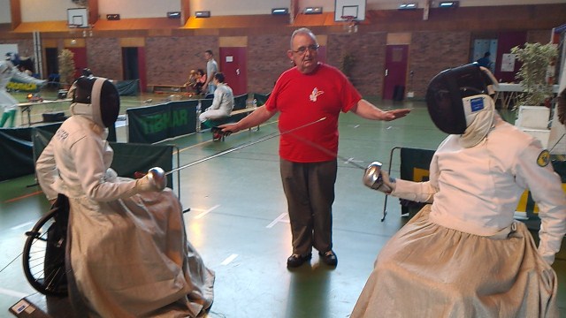 … et initiation à l’Escrime fauteuil, pratique qui permet aux « Handis » et « Valides » de se mesurer à armes égales (remerciements à Dominique du Cercle d’Escrime de Chantilly qui a amené tout le matériel)
